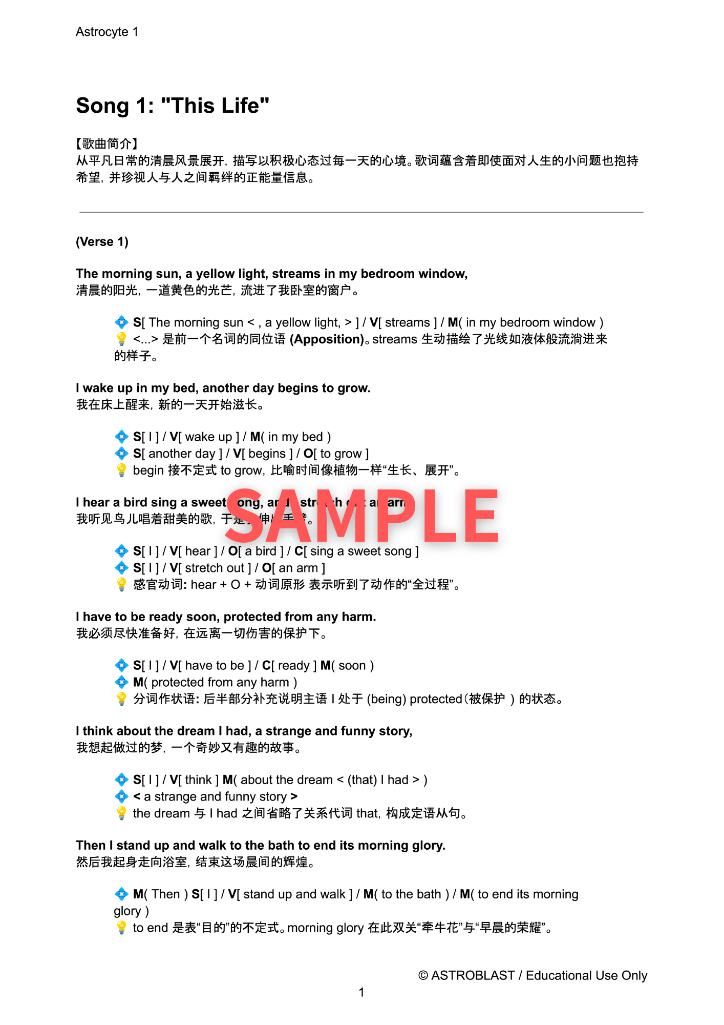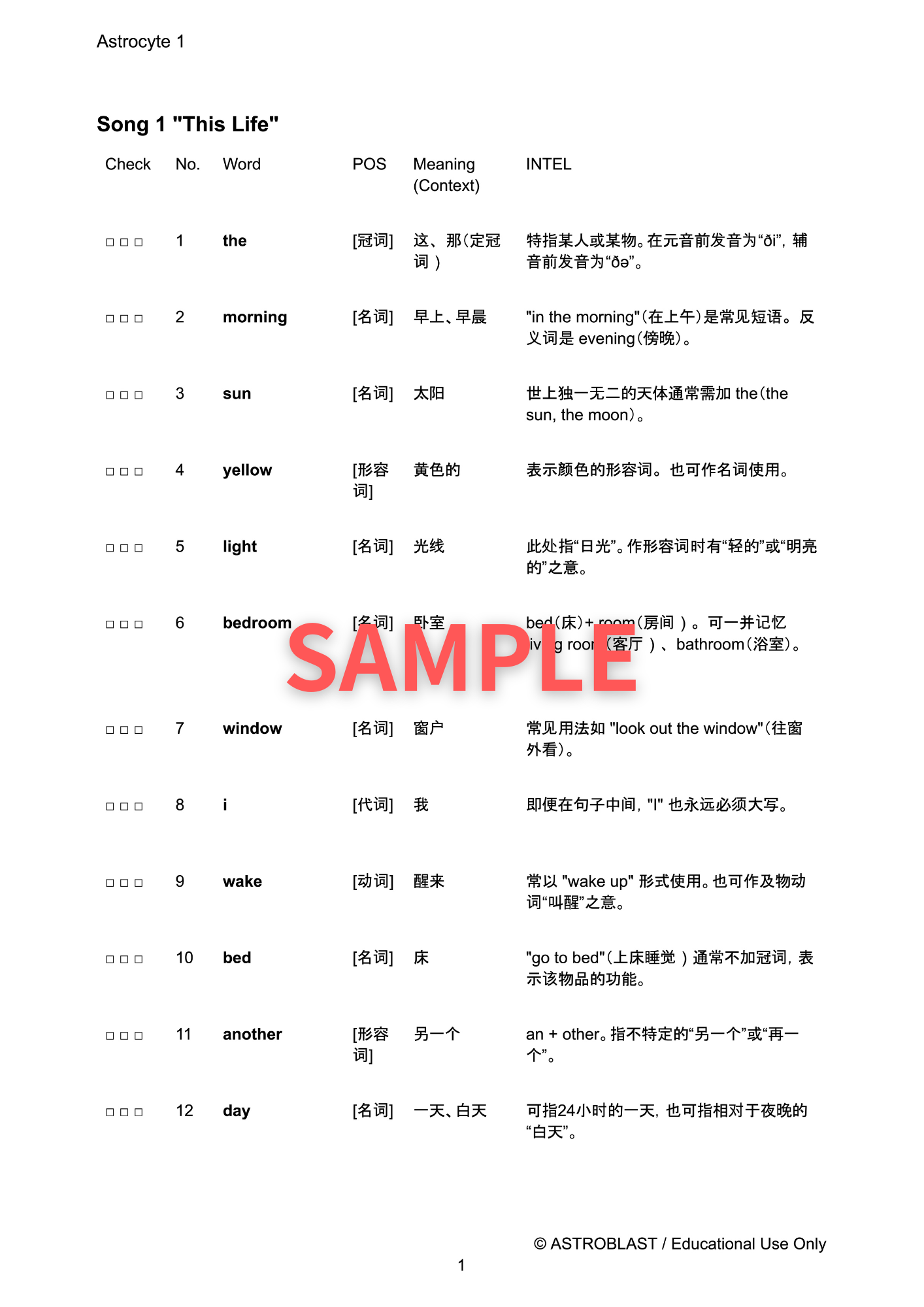您可以查看歌词、单词表、译文+语法讲解的各 1 页示例,了解实际教材的样子。